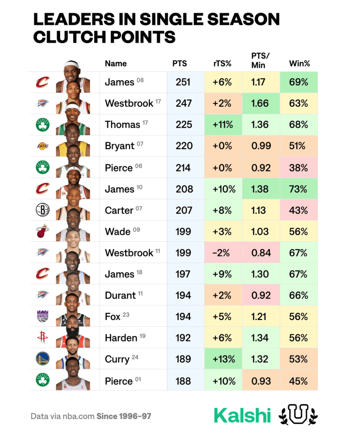 虎扑01月28日讯美媒BasketballUniversity分享数据:历史上单赛季关键时刻得分最多的球员;(最后5分钟分差5分以内)